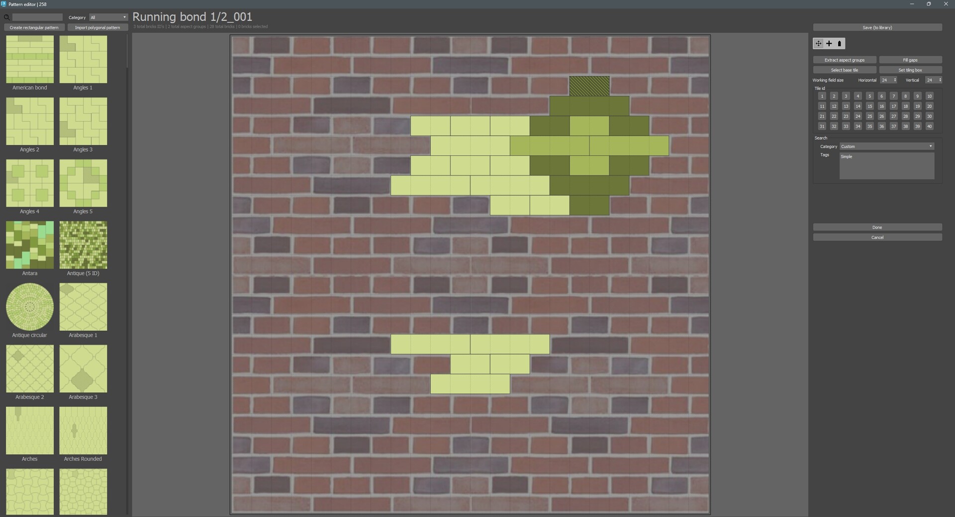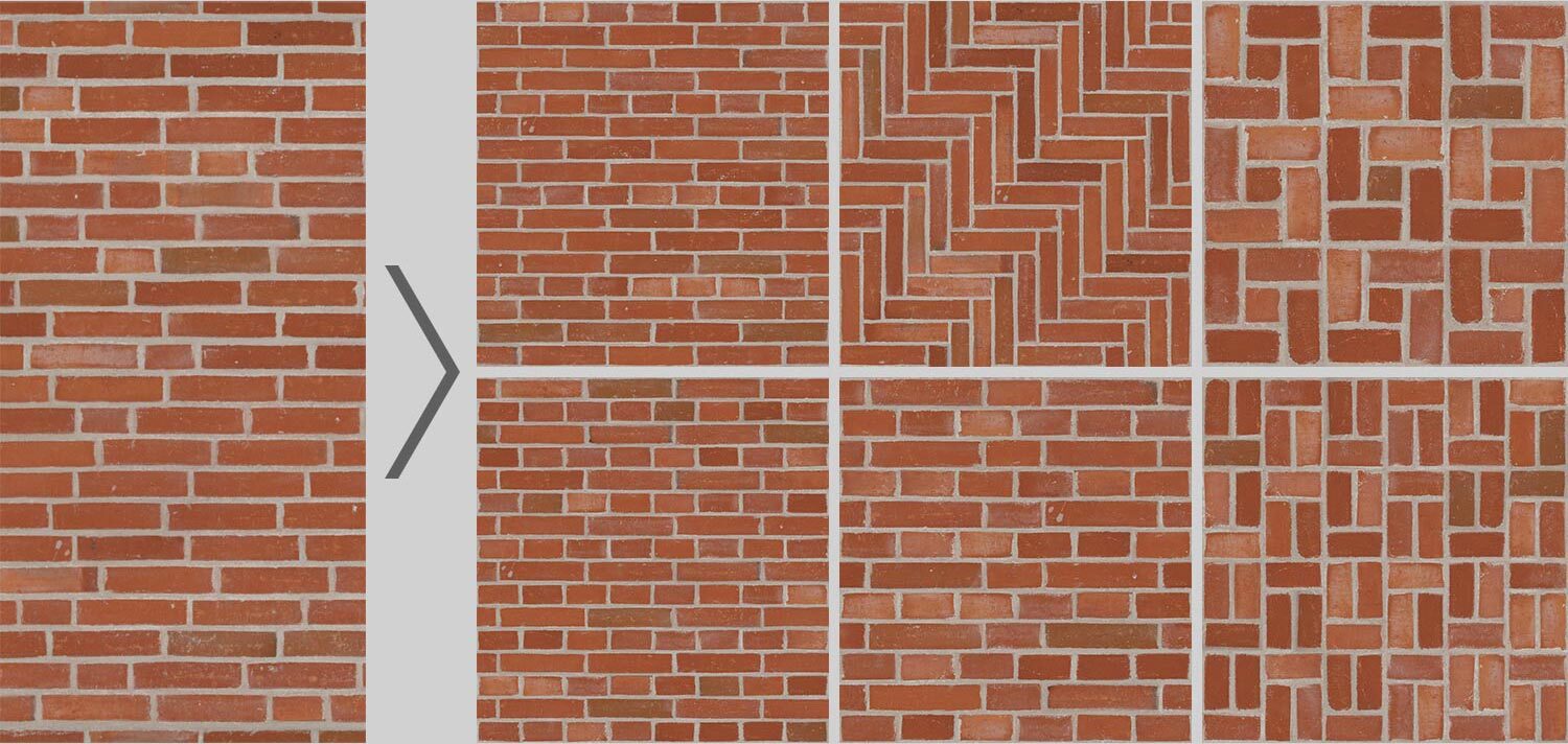 Существуют два основных варианта работы. Первый — реорганизация готовых плиточных текстур (у которых есть отдельные элементы и швы между ними), вроде кирпичной кладки или брусчатки.