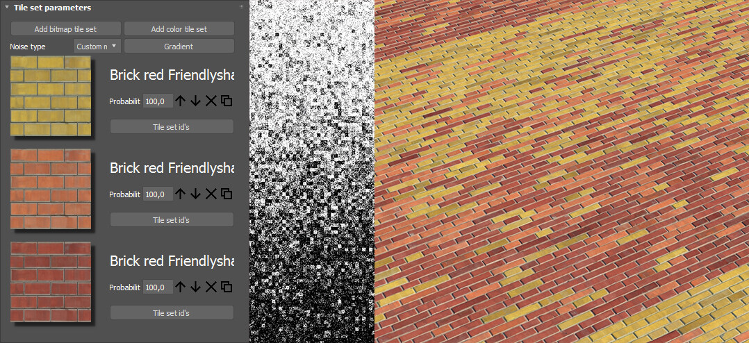 *Значения наклона находятся в диапазоне от 0 до 100 единиц, где 0 — абсолютно черный цвет, а 100 — абсолютно белый. Если вы применяете наклон к существующей карте displace, рекомендуется использовать в качестве исходного значения 50, и добиваться усиления наклона за счет отклонения от этого значения. Например для небольшого рандомного наклона плиток следует задавать значения в диапазоне от 40 до 60.