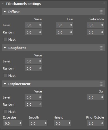 Данная секция отвечает за настройки рандомизации и редакцию цвета текстуры плиток. Здесь отображаются только те каналы, для которых добавлены текстуры или ровный цвет.