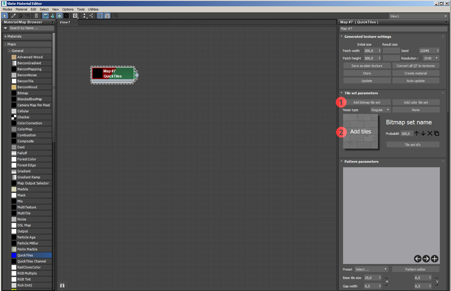 QuickTiles это плагин-текстура для 3d max. Он нарезает заданную вами текстуру на отдельные элементы, а потом пересобирает в указанном вами порядке. Он НЕ генерирует текстуры из ничего, по заданным параметрам. Для его использования необходимы исходные наборы текстур.