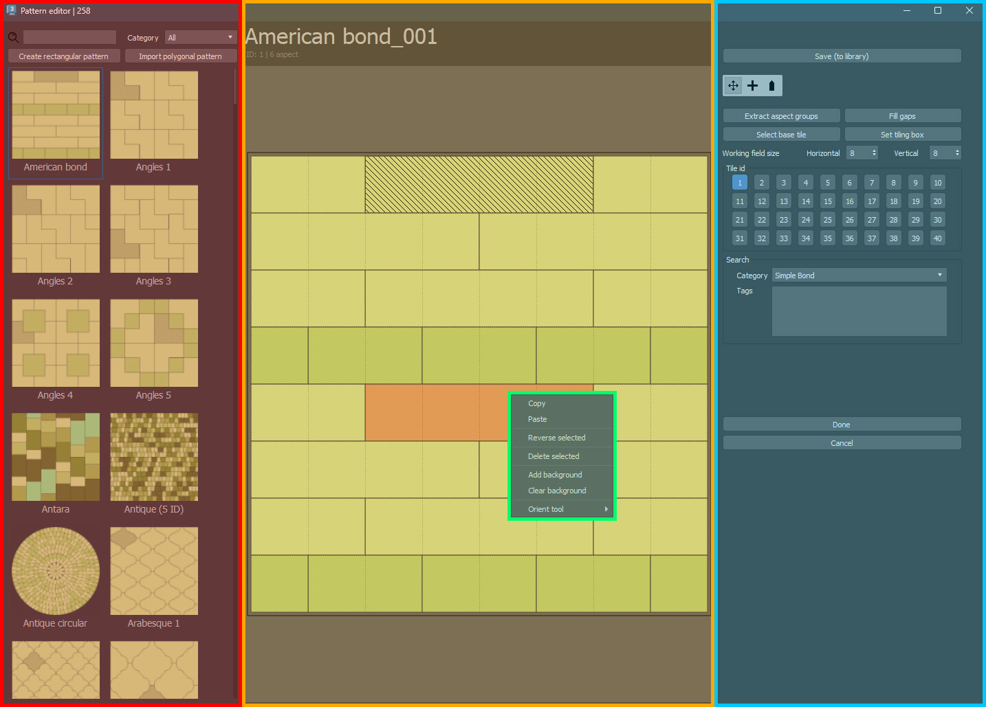 В целом весь процесс работы в QuickTiles можно разделить на 3 этапа. Внесение исходной текстуры и нарезка в Slice Editor, выбор или создание рисунка раскладки в Pattern Editor, и настройка деталей и рандомизаций в общем интерфейсе текстуры внутри Material editor.